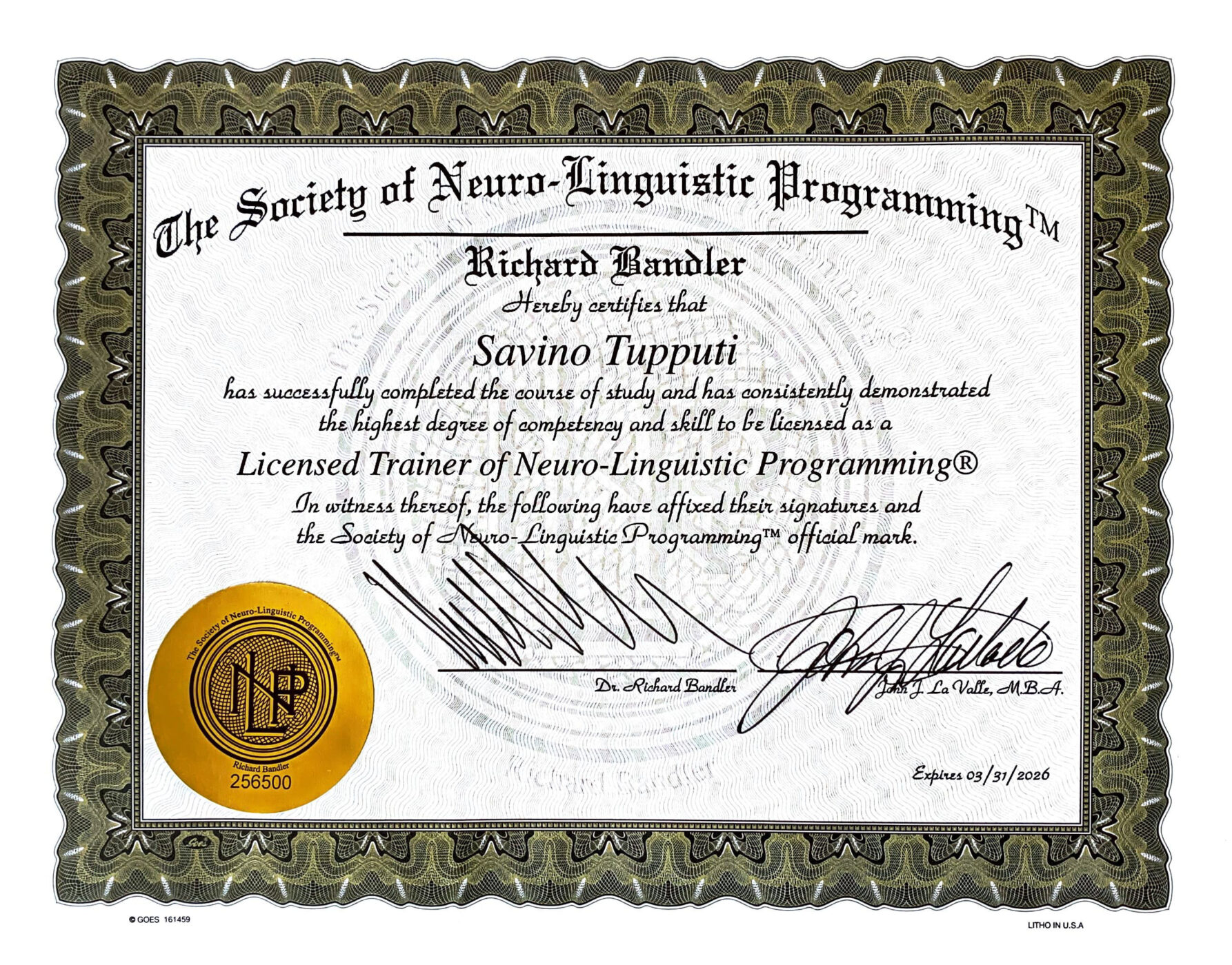 Dopo aver conosciuto il coaching e la PNL nel 1999, Savino Tupputi consegue la Certificazione di NLP Trainer e NLP Coach della Society of Nlp di Richard Bandler.